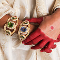 Hand carved and assembled from alloy of copper, micro-plated with Gold and fused with semi-precious Tribal stones.